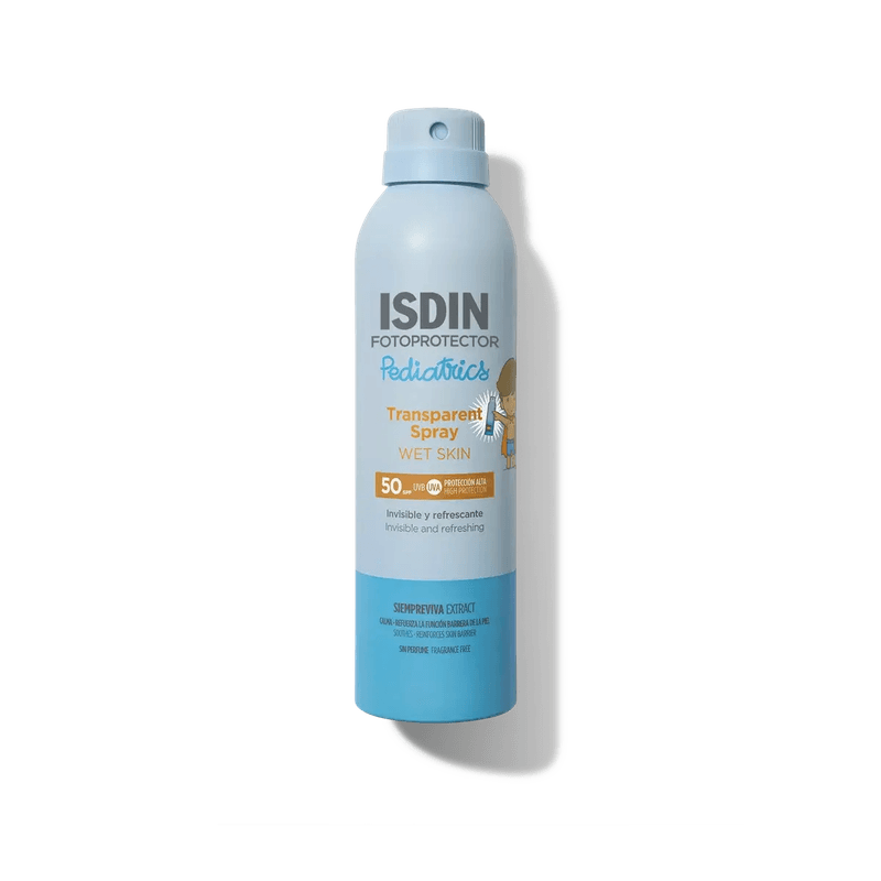 Protege su piel con Transparent Spray Wet Skin Pediatrics, el fotoprotector corporal transparente, fresco y de secado inmediato para niños y bebés a partir de 6 meses. Su fórmula contiene extracto de siempreviva, que ayuda a reforzar la barrera cutánea.