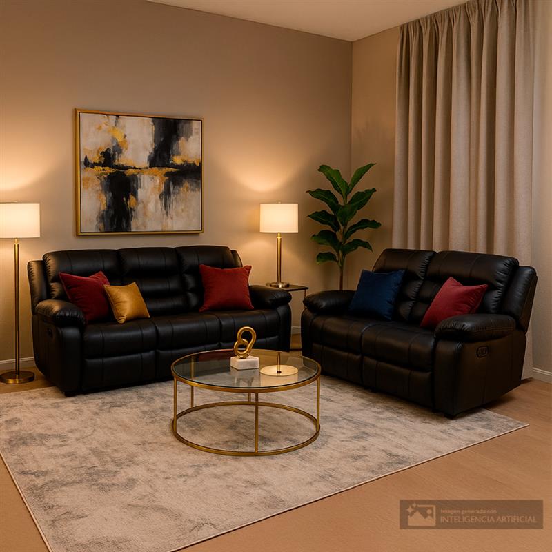 Disfruta de una experiencia de confort y funcionalidad con esta sala reclinable de elegante color negro, diseñada para acomodar hasta cinco personas en total. Con un sofá de tres plazas y un loveseat de dos, este conjunto no solo aporta un estilo moderno y cómodo a tu hogar, sino que también está pensado para el máximo disfrute. Los portavasos integrados en cada asiento ofrecen una solución práctica, permitiéndote tener tus bebidas al alcance mientras te relajas y disfrutas de tu espacio favorito.